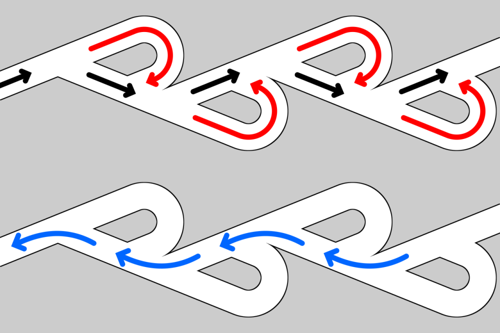 多个这样的分支连在一起后,反向进入的液体能量损失越来越大,最后就可能无法流动,从而成为一个特殊的止回阀。但正向进入的液体,却可以畅通无阻。比如你用特斯拉阀吸管喝水,正向可随意喝,反向你就很难喝到水了。